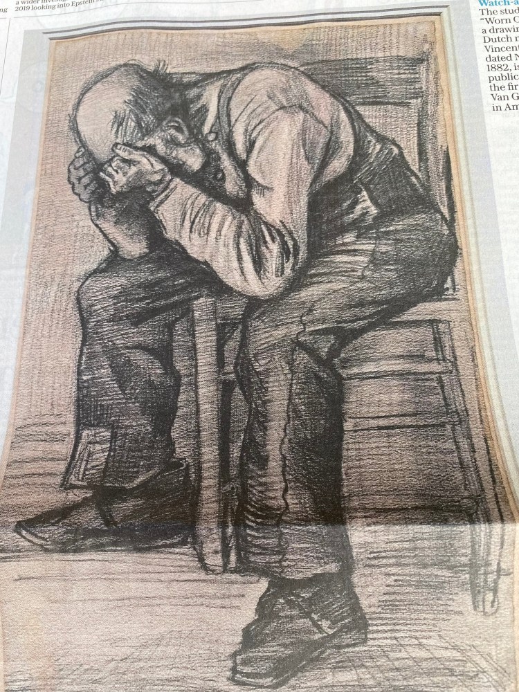 Van Gogh drew in November 1882 this pencilled drawing entitled’ Worn Out ‘ at the age of 29 at a time when male life expectancy was 39. Vincent made it to 37. Recently found the drawing is now on Public display in Amsterdam.
