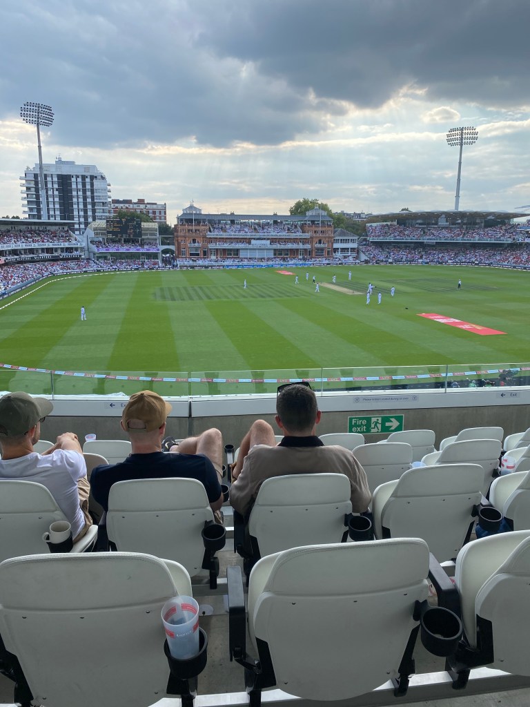 To arrive at the Stadium on time I had to rise early , drive into town as all the Public Transport had gone on strike, accommodate the 20 and 30 mph speed limits, navigate cycle lanes, squeeze my car into streets designed for horse and cart, pay a Congestion charge to enter London , pay an eco charge as I was driving a diesel dog and find parking like a needle in a haystack. Then I had to find a taxi and be driven to the hallowed ground. By the time I got there ( just making it on time ) it had cost me an arm and a leg ( no not cricket terms but an English idiom for cost me a fortune. My hosts were pleased to see me as I them as we made our way to our seats.